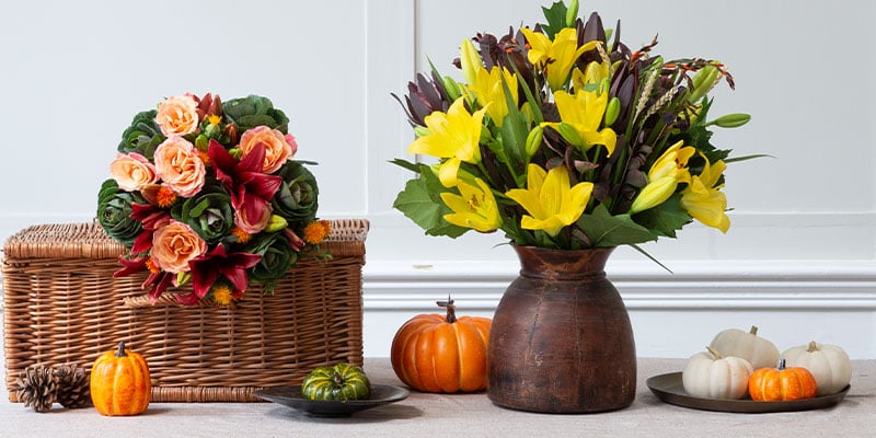 - Herbststräuße: Neben Halloween bieten auch klassische Herbststräuße viele Gestaltungsmöglichkeiten. Mit Chrysanthemen, Dahlien und buntem Laub lassen sich natürliche, warme Akzente setzen – ideal für die Übergangszeit zwischen Halloween und Winter.