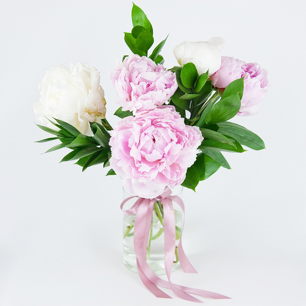 Es ist einfach unmöglich, sich nicht in den exquisit zarten Strauß aus weißen und rosa Pfingstrosen zu verlieben! Ein wunderbares Geschenk für die geliebte Frau oder jede junge Dame.