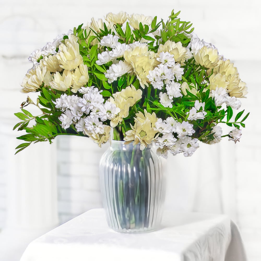 Der Chrysanthemum Blumenstrauß ist eine wunderschöne Kombination aus Farben und Texturen. Die Hauptattraktion dieses Straußes sind die Chrysanthemen, die in verschiedenen Farben wie Rosa, Gelb und Orange erhältlich sind. Diese Blumen verleihen dem Strauß eine lebendige und fröhliche Atmosphäre. Um den Chrysanthemum Blumenstrauß abzurunden, werden Pistazienblätter hinzugefügt, die dem Strauß eine elegante und natürliche Note verleihen. Die zarten grünen Blätter bilden einen wunderschönen Kontrast zu den leuchtenden Blüten der Chrysanthemen. Um diesen Blumenstrauß zusammenzuhalten und eine zusätzliche dekorative Note zu verleihen, ist der Chrysanthemum Blumenstrauß mit einem eleganten Verpackungsband gebunden. Dieses Band fügt eine subtile Eleganz hinzu und hält den Strauß sicher zusammen. Der Chrysanthemum Blumenstrauß ist die perfekte Geschenkwahl für verschiedene Anlässe wie Geburtstage, Jubiläen oder als Dankeschön. Mit seiner leuchtenden Farbvielfalt und der zusätzlichen Textur der Pistazienblätter ist dieser Strauß eine wunderschöne Möglichkeit, Freude und Glück zu verschenken. Entdecken Sie die Schönheit der Chrysanthemum Blumenstrauß und verbreiten Sie Freude mit diesem atemberaubenden Strauß. Lass Dich von den leuchtenden Farben und der zarten Eleganz verzaubern.