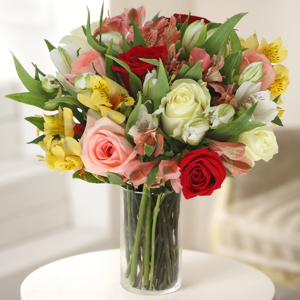 Der Blumenstrauß besteht aus Alstroemeria und Rosen mit einer Länge von 50-60cm. Die zarten Alstroemeria-Blüten in ihren zarten Farben verleihen dem Strauß einen eleganten Touch. Die Rosen, präsentiert in ihrem leuchtenden Farbton, fügen dem Strauß eine romantische Note hinzu. Die Kombination dieser beiden Blumenarten schafft ein harmonisches und ansprechendes Gesamtbild. Um den Strauß zusammenzuhalten und ihm einen letzten Schliff zu verleihen, ist er mit Verpackungsband umwickelt. Ein perfektes Geschenk für besondere Anlässe oder einfach nur, um jemandem eine Freude zu machen.