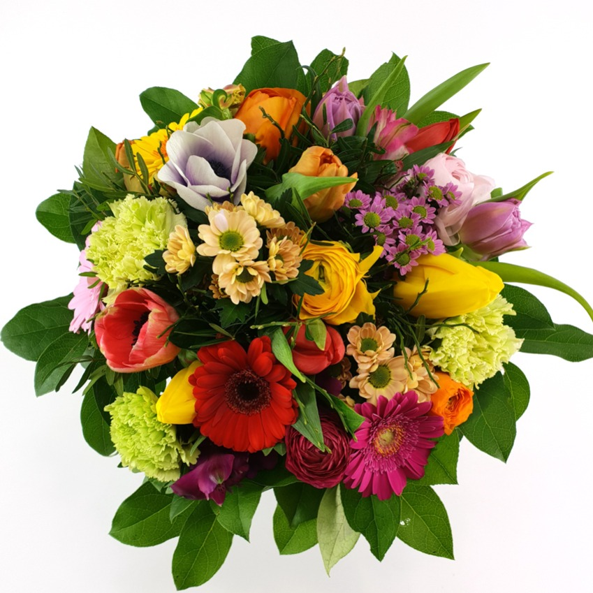 Der Strauß Happy Spring besticht durch seine bunte Blütenvielfalt. Er versetzt jeden in Frühlingsstimmung durch seine fröhliche Farbkombination mit Grün und Blattabschluß.