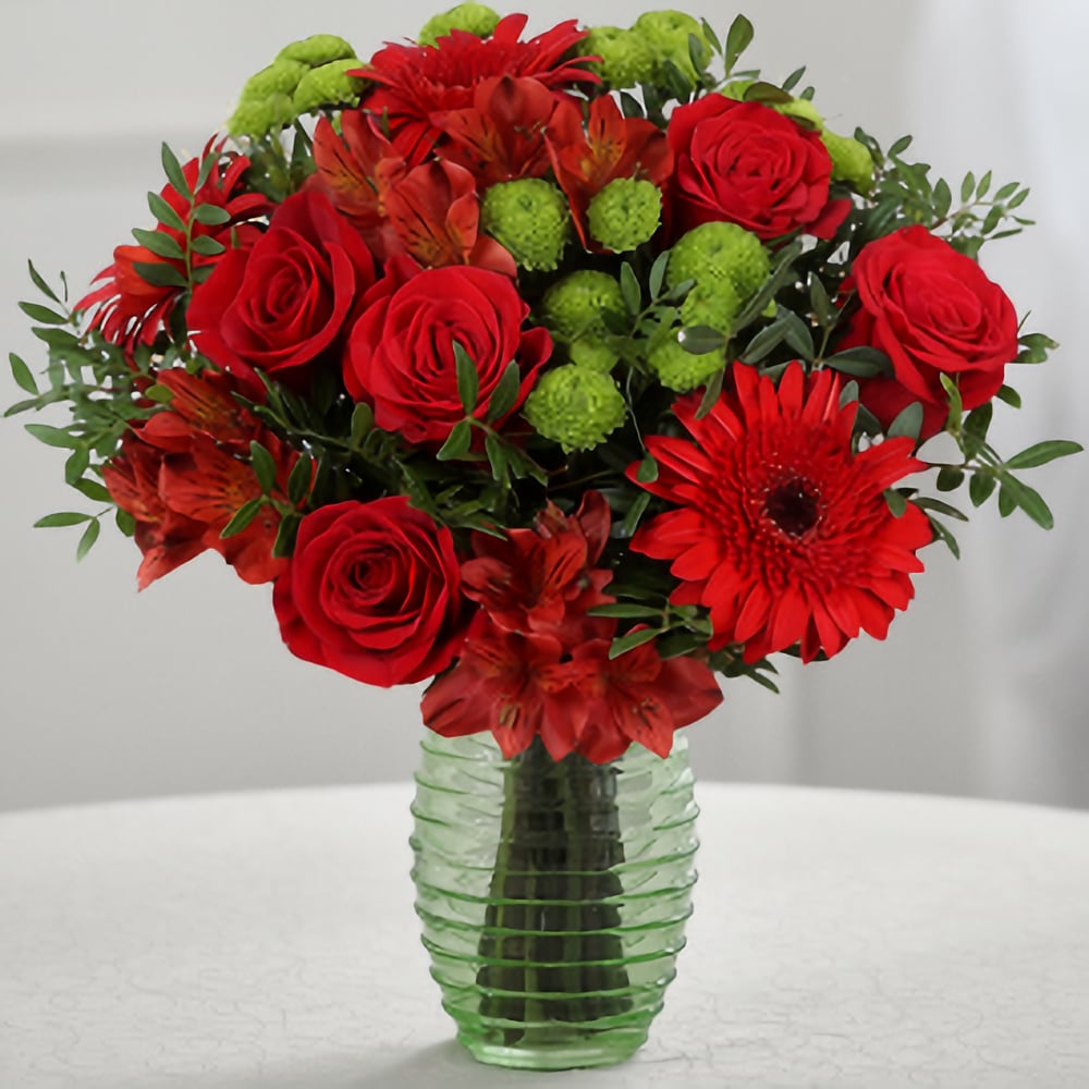 Dieser wunderschöne Blumenstrauß besteht aus einer Kombination verschiedener Blumenarten, die harmonisch miteinander verbunden sind. Die Alstroemerien verleihen dem Strauß mit ihren zarten Blüten in zarten Pastelltönen eine elegante Note. Die Rosen, die eine Höhe von 50-60cm erreichen, sind die Hauptattraktion und strahlen mit ihrer leuchtend roten Farbe eine romantische Atmosphäre aus. Die Gerbera-Blumen ergänzen den Strauß perfekt mit ihren strahlenden Farben und runden Blütenköpfen. Die Chrysanthemen fügen eine zusätzliche Schönheit hinzu, da ihre Blüten in verschiedenen gelben und orangen Nuancen erstrahlen. Für einen Hauch von Grün wurden Pistazienblätter verwendet, die dem Strauß Textur und Fülle verleihen. Um den Blumenstrauß zu vervollständigen, wurde ein dekoratives Verpackungsband verwendet, das den Übergang von den Blüten zur Hand gehaltenen Basis abschließt. Dies verleiht dem Strauß einen sauberen und professionellen Look. Die Abwesenheit einer Verpackung oder Vase betont die natürliche Schönheit der Blumen und ermöglicht es dem Empfänger, den Strauß sofort in einer Vase seiner Wahl zu präsentieren. Dieser Blumenstrauß eignet sich perfekt als Geschenk für verschiedene Anlässe wie Geburtstage, Jubiläen oder einfach nur, um jemandem besondere Wertschätzung oder Liebe zu zeigen. Mit seiner vielfältigen Kombination von Blumen und der sorgfältigen Gestaltung wird dieser Blumenstrauß sicherlich Herzen erfreuen und den Raum mit seiner frischen und belebenden Präsenz beleben.