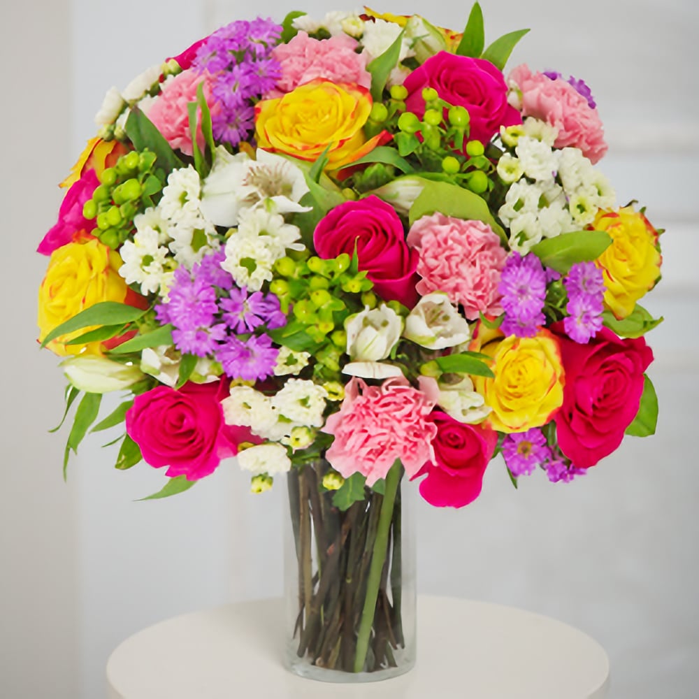 Dieser wunderschöne Blumenstrauß besteht aus einer Kombination von verschiedenen Blumen und Grünzeug, die harmonisch miteinander verschmelzen. Die Hauptblumen sind Astern, Rosen (50-60cm), Nelken u...