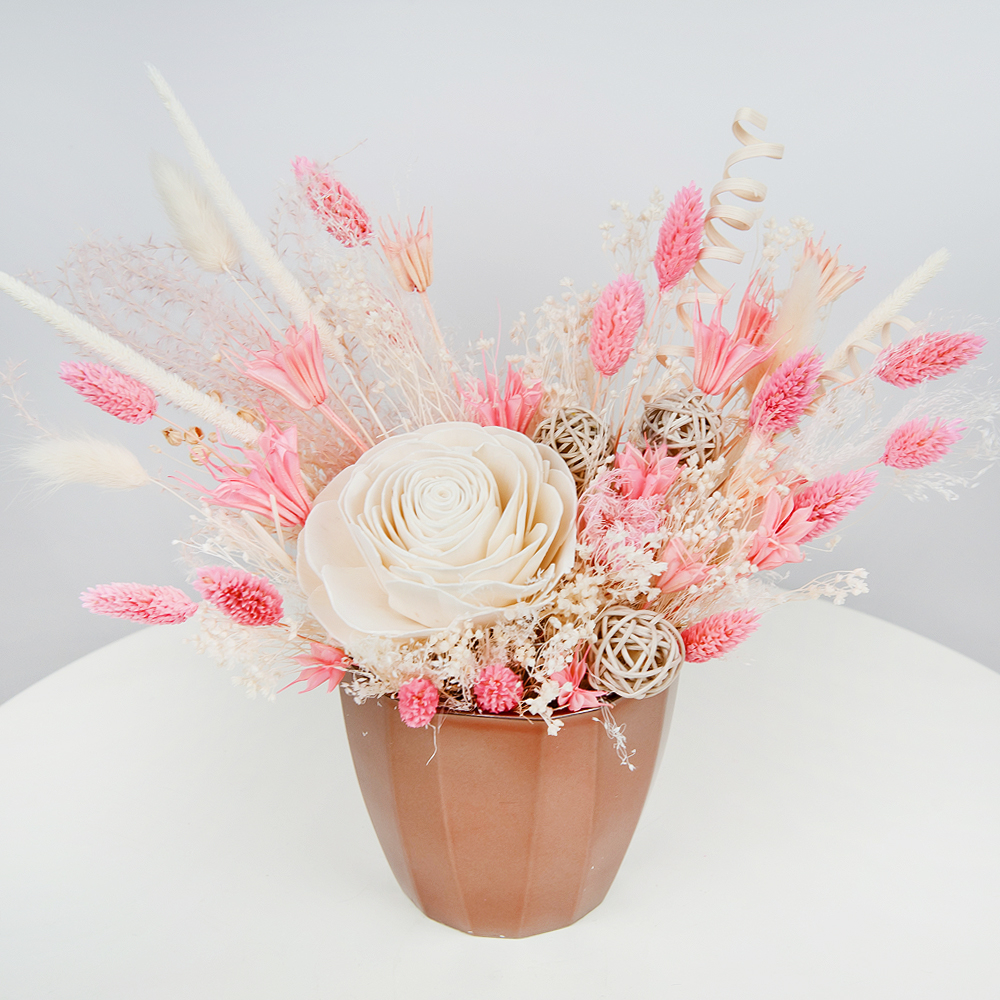 Der Strauß "Rosa Eis" ist eine exquisite Kombination aus Zärtlichkeit und Kühle, die Ihrem Interieur eine Note von Luxus und Eleganz verleiht. Der Strauß besteht aus Trockenblumen und ist mit dekorativen Elementen verziert. Er wird in einem stilvollen Keramiktopf präsentiert, der die Komposition harmonisch ergänzt. Der Strauß "Rosa Eis" wurde von erfahrenen Floristen ausschließlich mit hochwertigen Trockenblumen kreiert. Er wird Sie lange Zeit mit seiner Schönheit und Originalität erfreuen. Dieser Strauß ist ein wunderbares Geschenk für jeden Anlass - sei es ein Einzug, Geburtstag oder einfach der Wunsch, sich selbst oder nahe stehenden Personen eine Freude zu machen.
