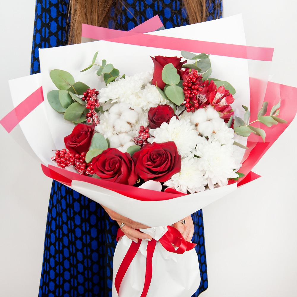 Dieser prächtige Strauß aus Rosen, Chrysanthemen, Johanniskraut und weichen Watte-Stäbchen ist ein wahres Meisterwerk, das sich hervorragend eignet, um Liebe, Dankbarkeit oder Geburtstagsgrüße auszudrücken.