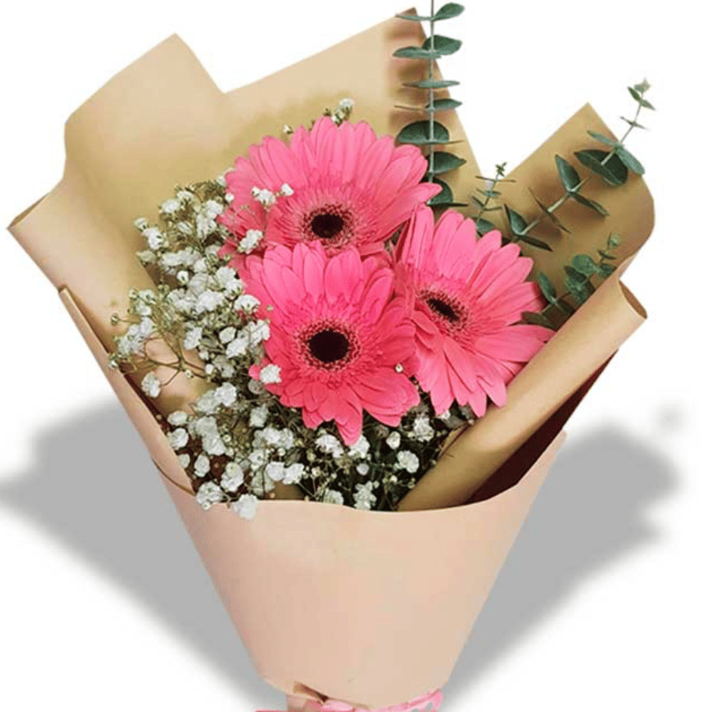 Ein bezaubernder Strauß aus zarten Gerbera-Blüten, ergänzt durch die luftige Leichtigkeit der Gypsophila und das frische Grün des Eukalyptus. Die elegante Verpackung rundet das Arrangement stilvoll ab und macht es zu einer perfekten Wahl für besondere Momente oder als liebevolle Geste. Ein Strauß, der Anmut und Natürlichkeit vereint, um Herzen zu berühren und Freude zu schenken.